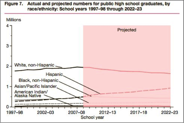 The 2014 data released by the NCES shows that this trend has continued since 2010 and will continue for the foreseeable future. Through the 2022-2023 school year, the number of white students graduating is projected to decline by another 16 percent. A 14 percent decrease in the number of black students and a 29 percent decrease in the number of American Indian and Alaskan Native students that graduate from public high schools is expected as well. Conversely, other minority groups are expected